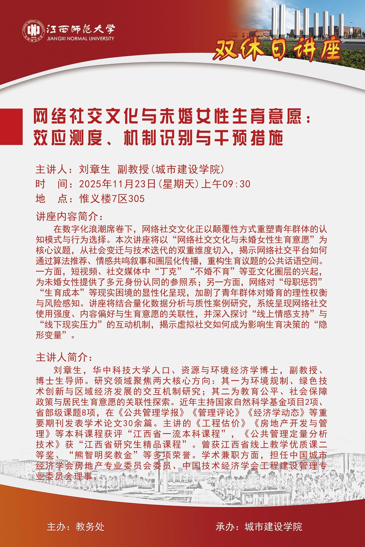 在数字化浪潮席卷下,网络社交文化正以颠覆性方式重塑青年群体的认知模式与行为选择。本次讲座将以“网络社交文化与未婚女性生育意愿”为核心议题,从社会变迁与技术迭代的双重维度切入,揭示网络社交平台如何通过算法推荐、情感共鸣叙事和圈层化传播,重构生育议题的公共话语空间。一方面,短视频、社交媒体中“丁克”“不婚不育”等亚文化圈层的兴起,为未婚女性提供了多元身份认同的参照系;另一方面,网络对“母职惩罚”“生育成本”等现实困境的显性化呈现,加剧了青年群体对婚育的理性权衡与风险感知。讲座将结合量化数据分析与质性案例研究,系统呈现网络社交使用强度、内容偏好与生育意愿的关联性,并深入探讨“线上情感支持”与“线下现实压力”的互动机制,揭示虚拟社交如何成为影响生育决策的“隐形变量”。